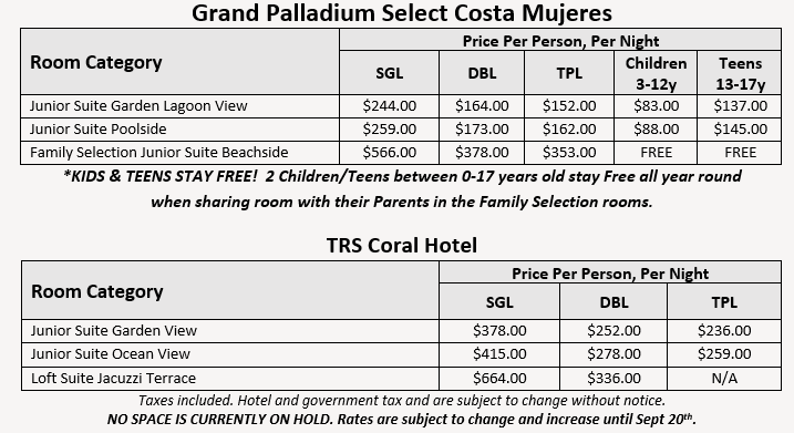 Every 16th passenger will be complementary. Free passengers subject to maximums and terms and conditions. (Grand Palladium Costa Mujeres).